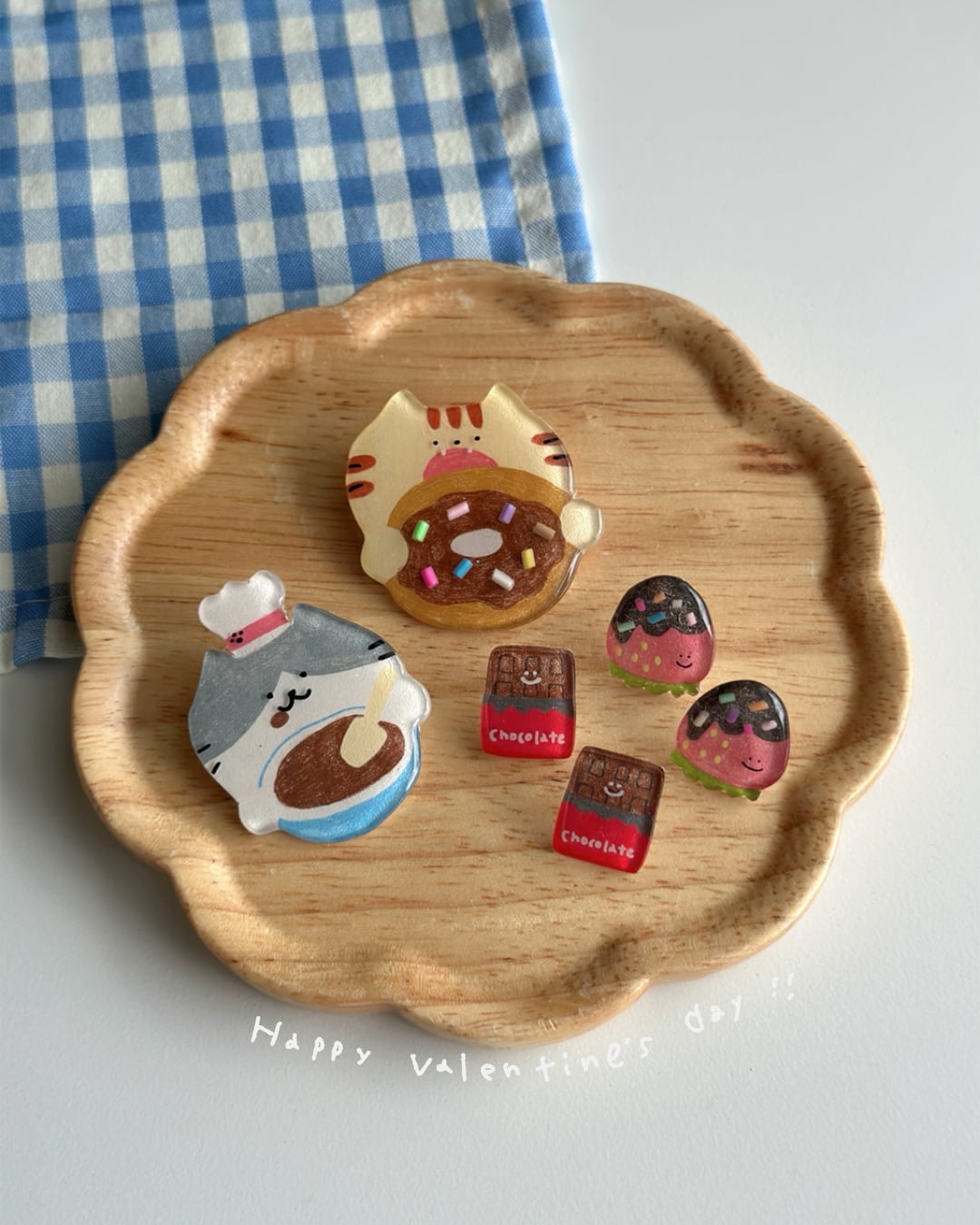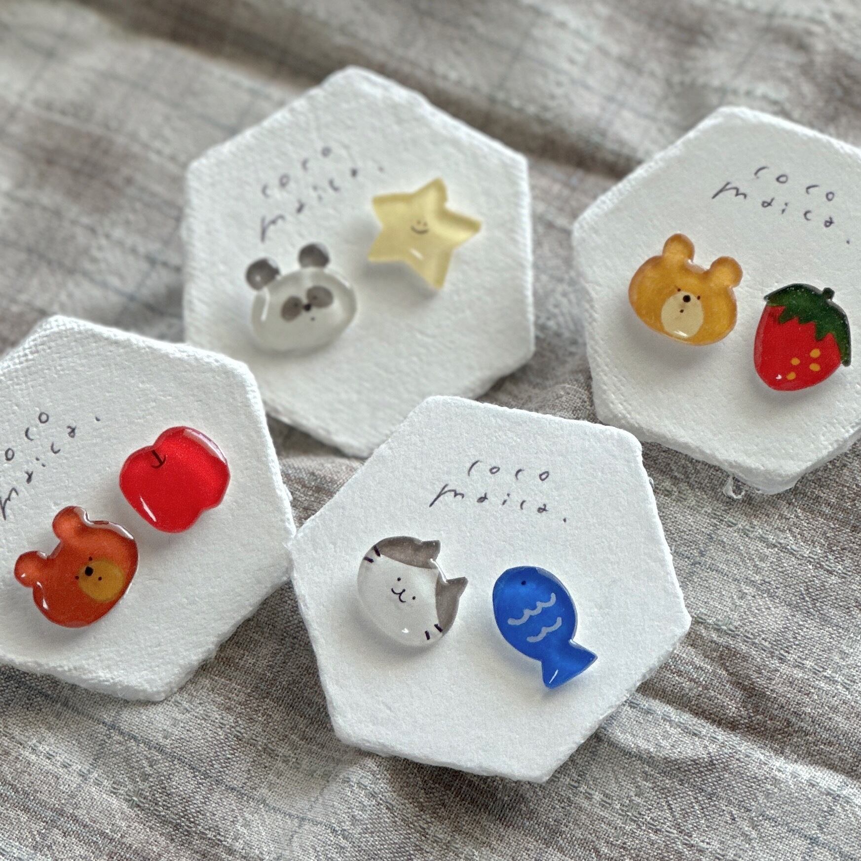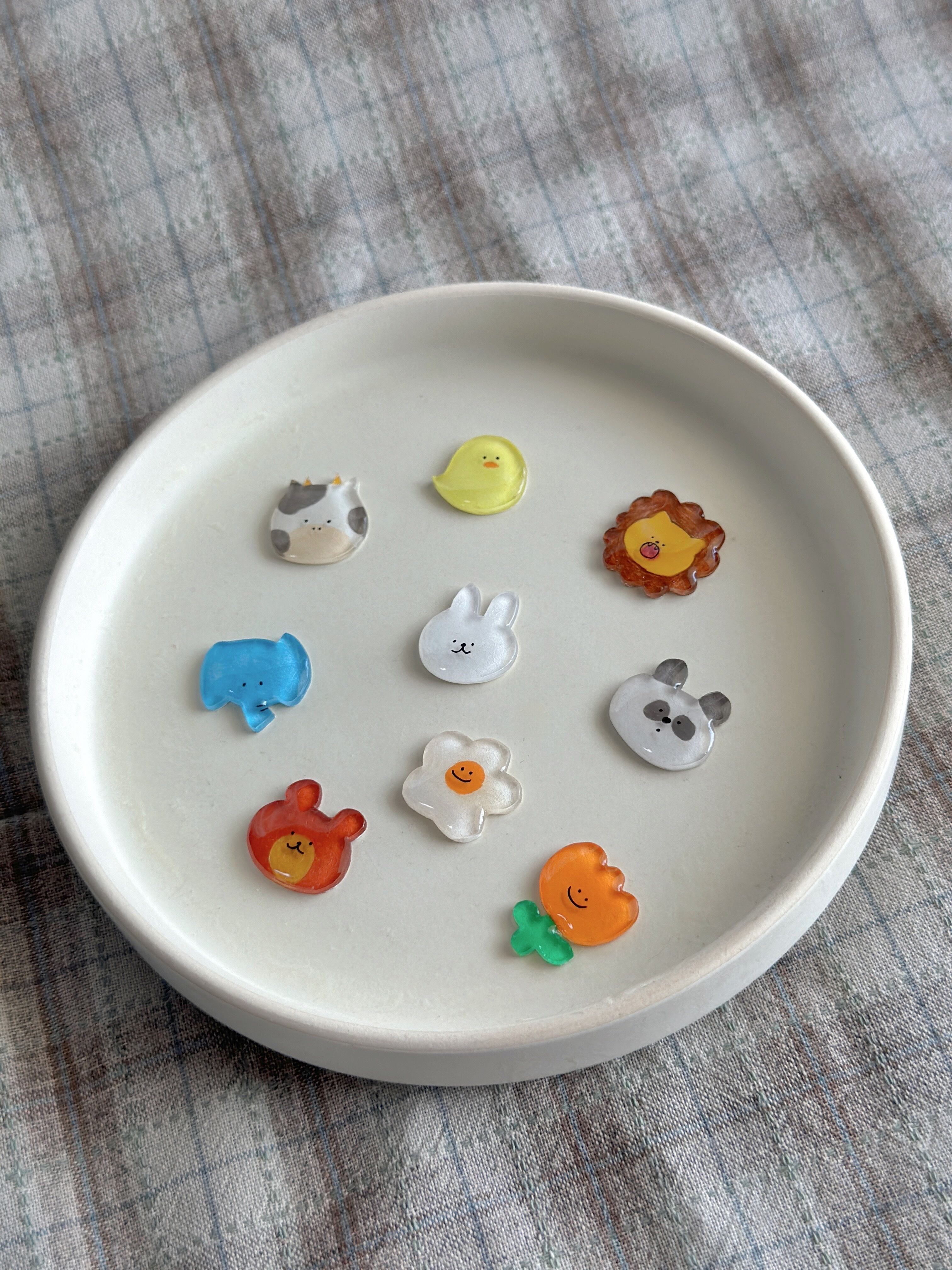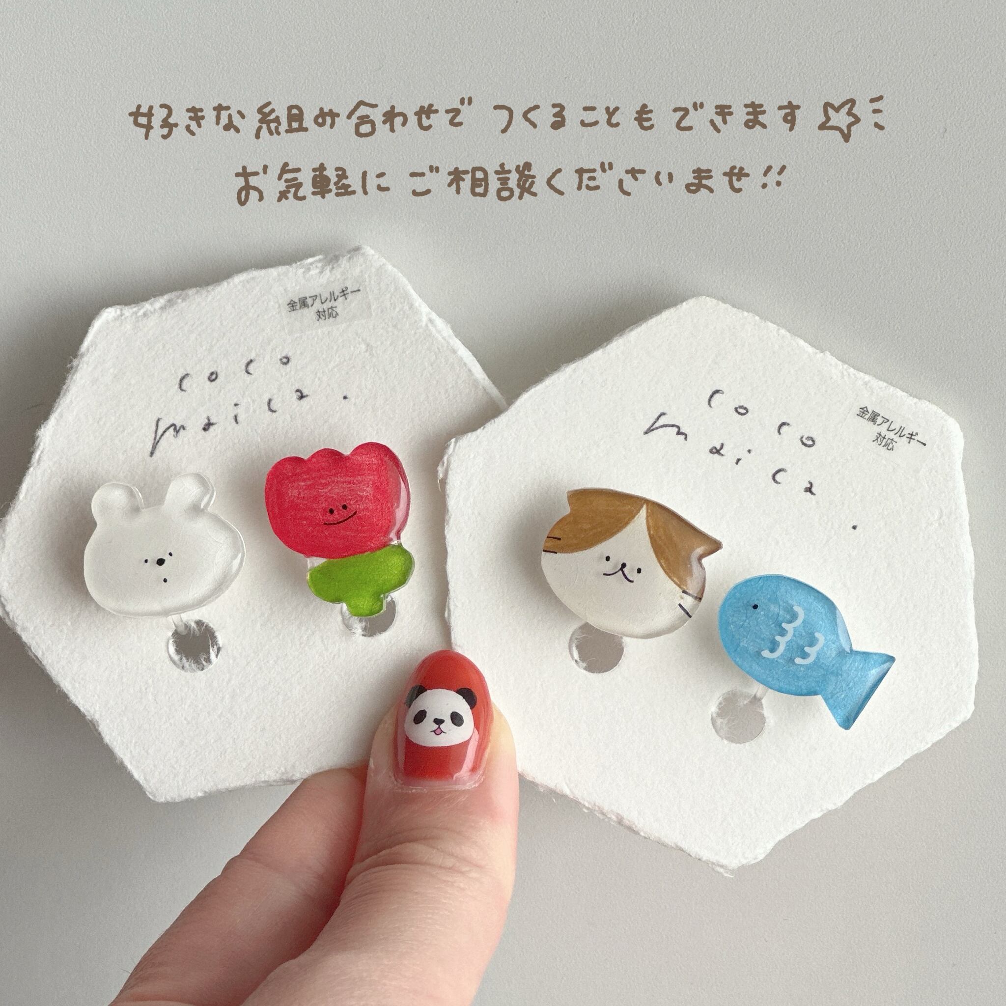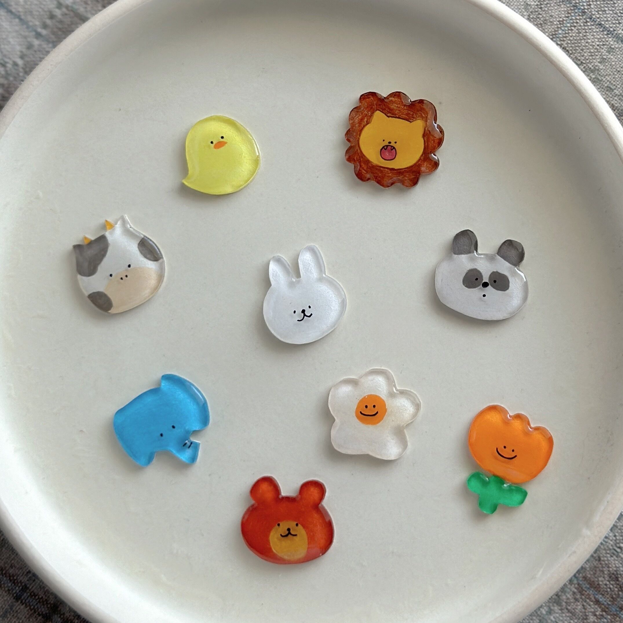 プラバンに描き、レジンでツヤツヤぷっくり仕上げました。