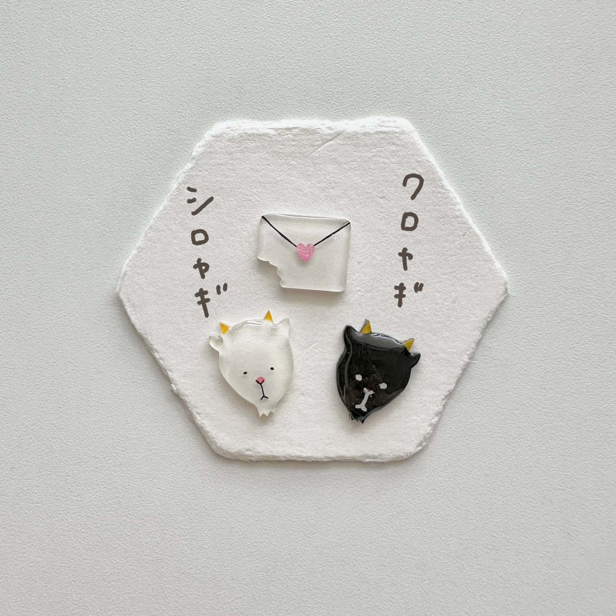 プラバンに描き、レジンでツヤツヤぷっくり仕上げました。